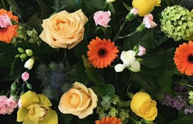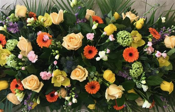 A luxury colourful casket spray including, coloured roses, orchids, gerbera's, delicate green viburnum snowball and scented freesias