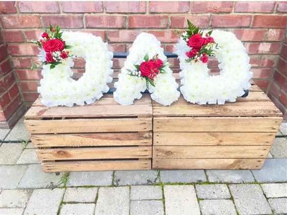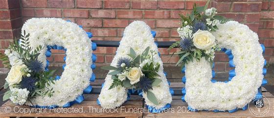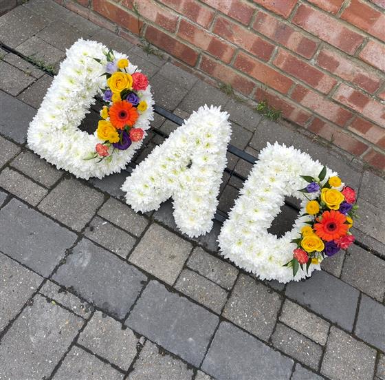 A beautiful fresh flower white chrysanthemum based DAD letter funeral tribute with luxury roses and thistle complimented with eucalyptus foliage.