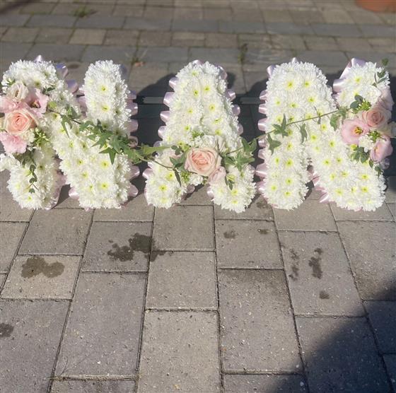 A beautiful classic white NAN letter tribute with luxury roses in your choice of colours, eustoma, white carnations and complimenting foliage.