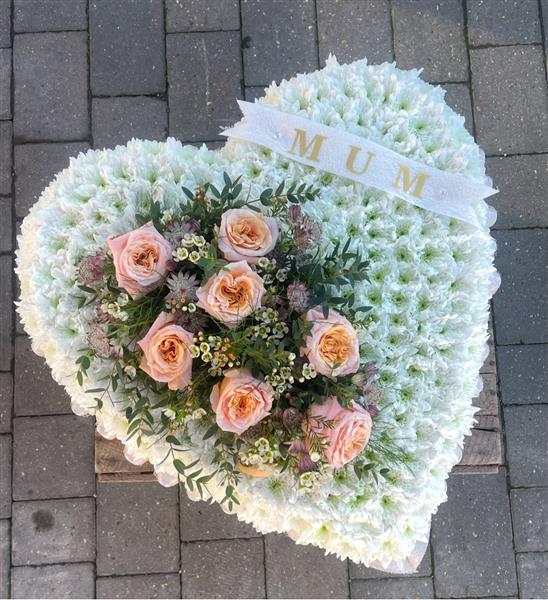 A beautiful heart-shaped tribute, featuring fresh peach roses. This traditional floral arrangement features a soft white base of delicate chrysanthemums. At its centre, a graceful spray of luxury peach roses, and delicate blooms of astrantias, wax flowers, and seasonal foliage adds a warm, heartfelt touch.