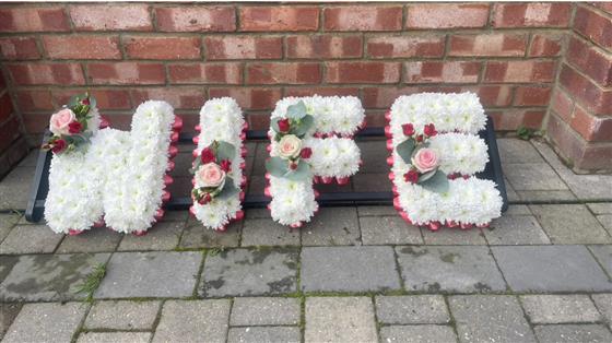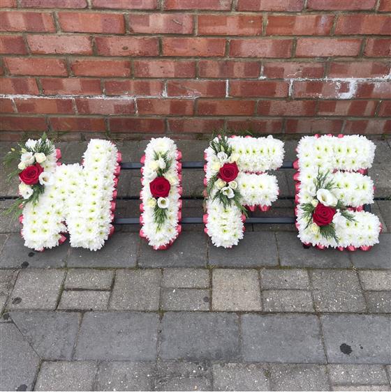 A white chrysanthemum based WIFE word tribute in contrasting colours of cerise pink ribbon edging, light pink roses and cerise mini roses, creates a striking tribute.